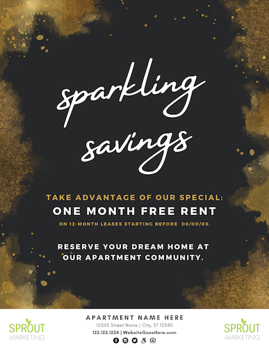 It's the season to sparkle and we are celebrating with a major special: ______ [special goes here]. Want to learn more about our beautiful apartment homes with _________ [list a few amenities]? Schedule your tour today with one of our amazing team members: _________ [website/phone]. We can't wait for you to share your sparkle with our community! #apartments #apartmentsavings