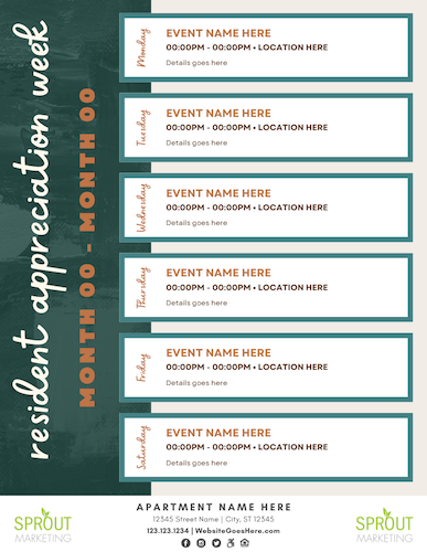 We've themed out each day to make planning your resident appreciation week much easier. Plus, we are providing you with a variety of different options each day that you can mix and match to make your own. Download here or view below.