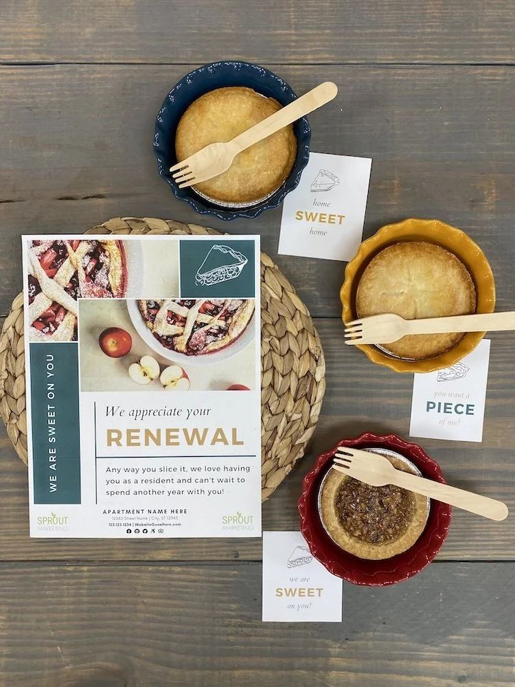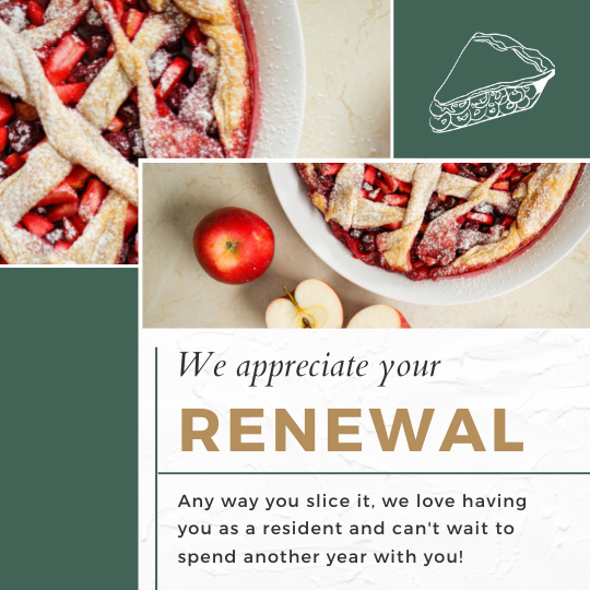 Grab & Go Renewal Reminder – offer individual slices or hand pies for residents to pick up at the office when they stop by to discuss renewals.