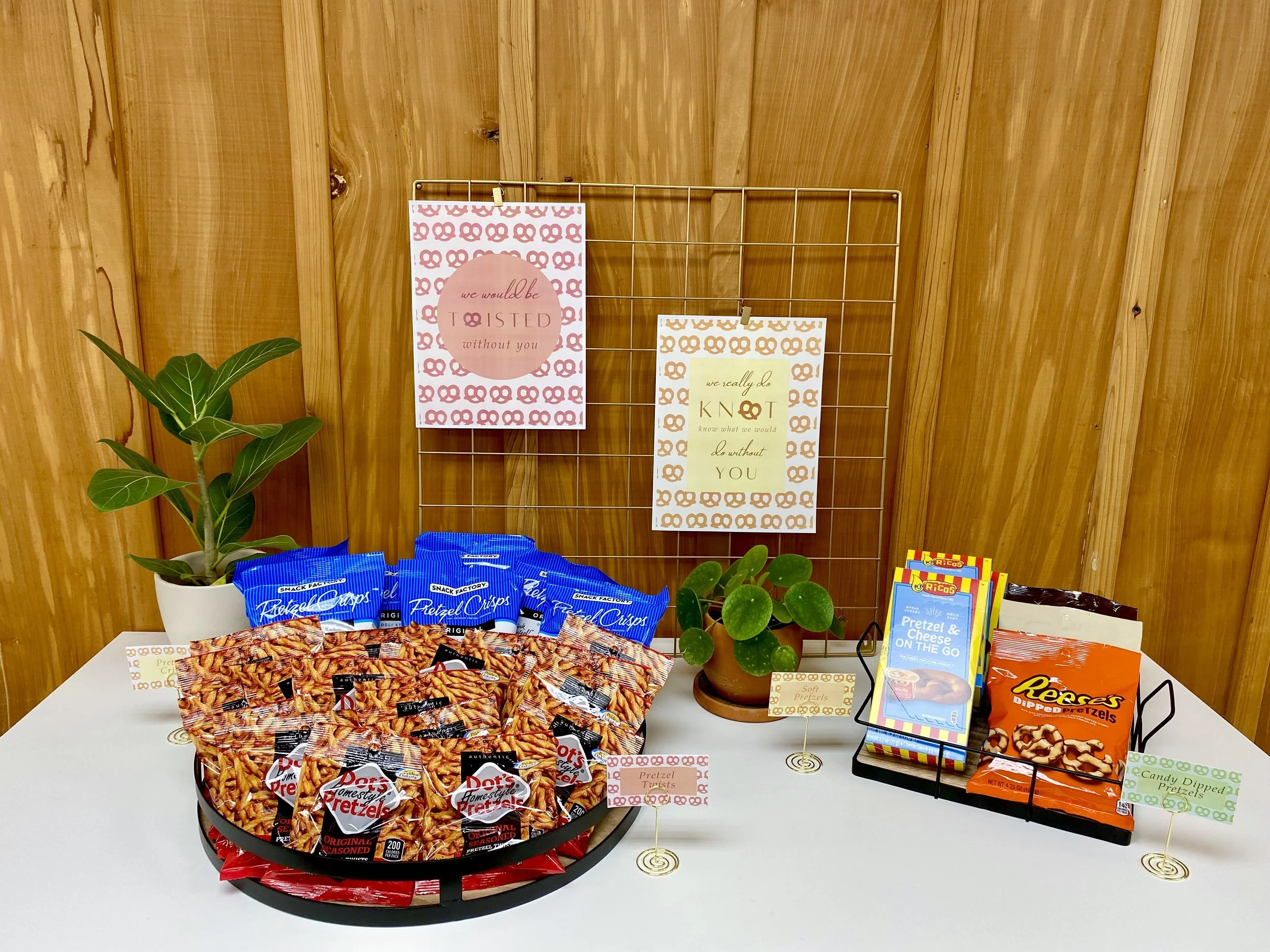 Play light background music and add simple décor in warm browns and golds to match the pretzel theme.