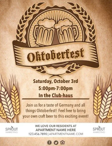 Happy Oktoberfest! We’re wishing we were in Germany right about now, but why not celebrate this beer-utiful time of year right here at our community?! How about we have a little Oktoberfest of our own in the _________ (community area, leasing office, etc)? We’ll provide the bier and brats! Come on down on ______ (date) at _____ (time) to party it up! PROST to that!