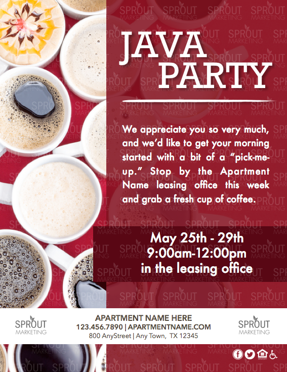 Use the opportunity to remind residents about your coffee/drink bar in the community clubhouse and invite them to stop by. It never hurts to remind residents that they’re saving $$$ by grabbing coffee with you instead of driving through Starbucks! #amenityperk