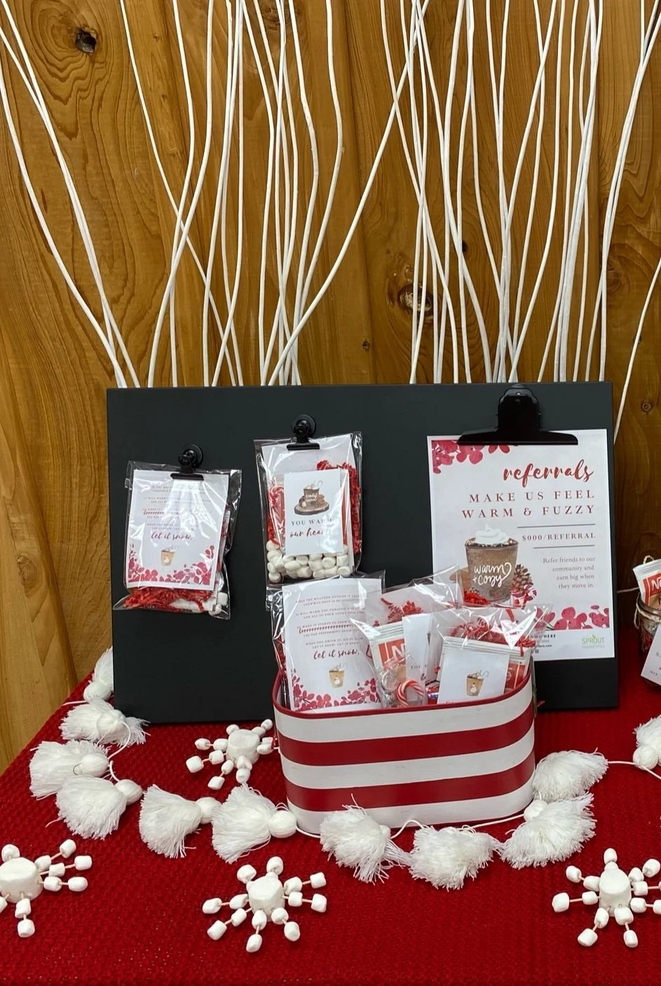 Place the goodies in a cute basket or on a platter next to the referral design.
