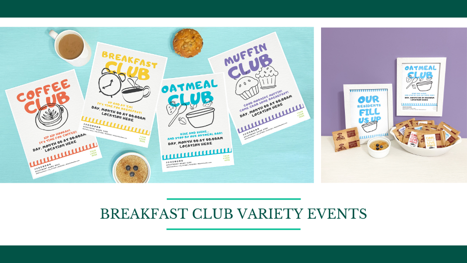 Start the day right with our Breakfast Club resident event — a fun, grab-and-go morning featuring Coffee, Muffins, Oatmeal, or a Full Breakfast spread. It’s an easy, modern way to build community and remind residents that cool people live here.