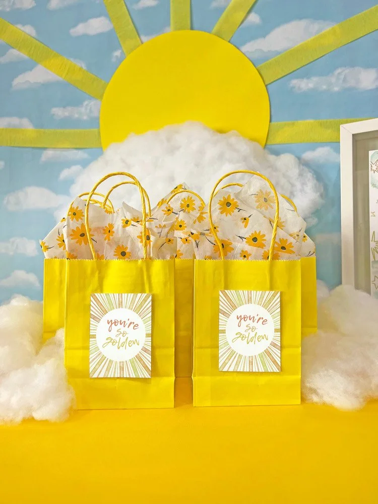 Start by assembling bright, happy yellow bags and tissue paper. Fill them with yellow candies, drinks and sunny surprises - whatever fits your budget.