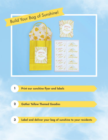 Brighten your community—and your residents’ day—with a cheerful Bag of Sunshine Appreciation Event. This simple, feel-good idea is all about spreading positivity with a grab-and-go bag filled with fun, yellow-themed goodies that instantly lift moods and create a memorable moment.