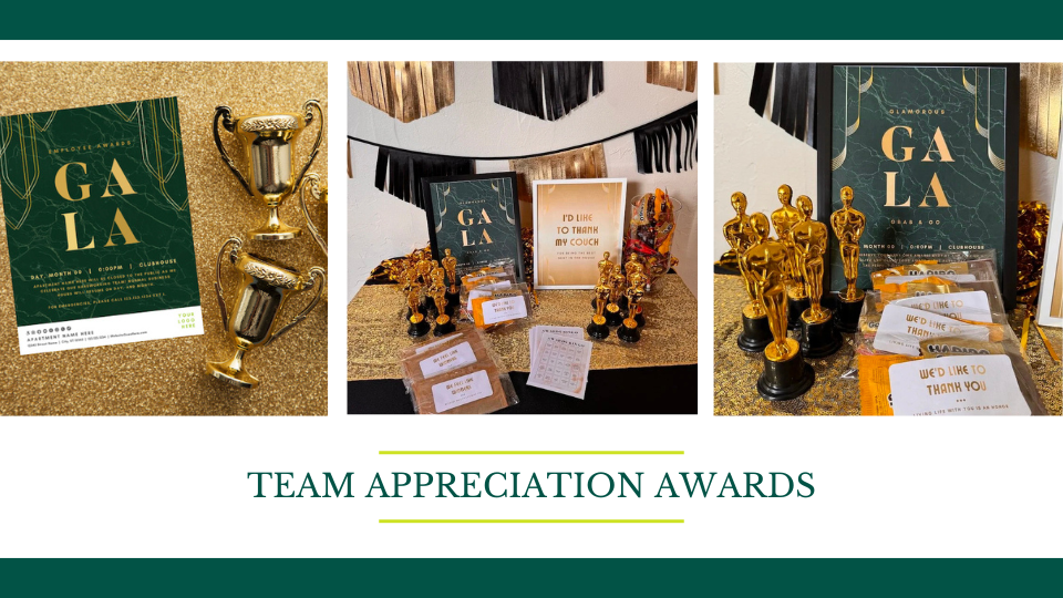 Roll out a fun, red-carpet-style gala and host an Employee Awards Event to celebrate your team’s hard work. Create lighthearted award categories like Leasing Legend, Maintenance MVP, Resident Whisperer, or Team Player of the Year. Add simple touches and printed certificates or small trophies to elevate the moment without overcomplicating it.