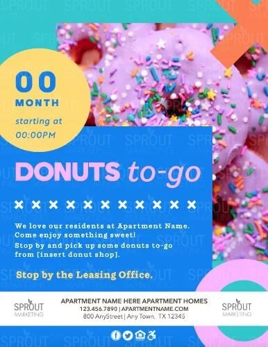 Customize and/or download the graphic above. Post full-page flyers in public areas and leave 1/4 page flyers at their doors so that your residents know to swing by the office and grab a sweet dessert! Pro tip: Write a little note on the back of the 1/4 page flyers :)
